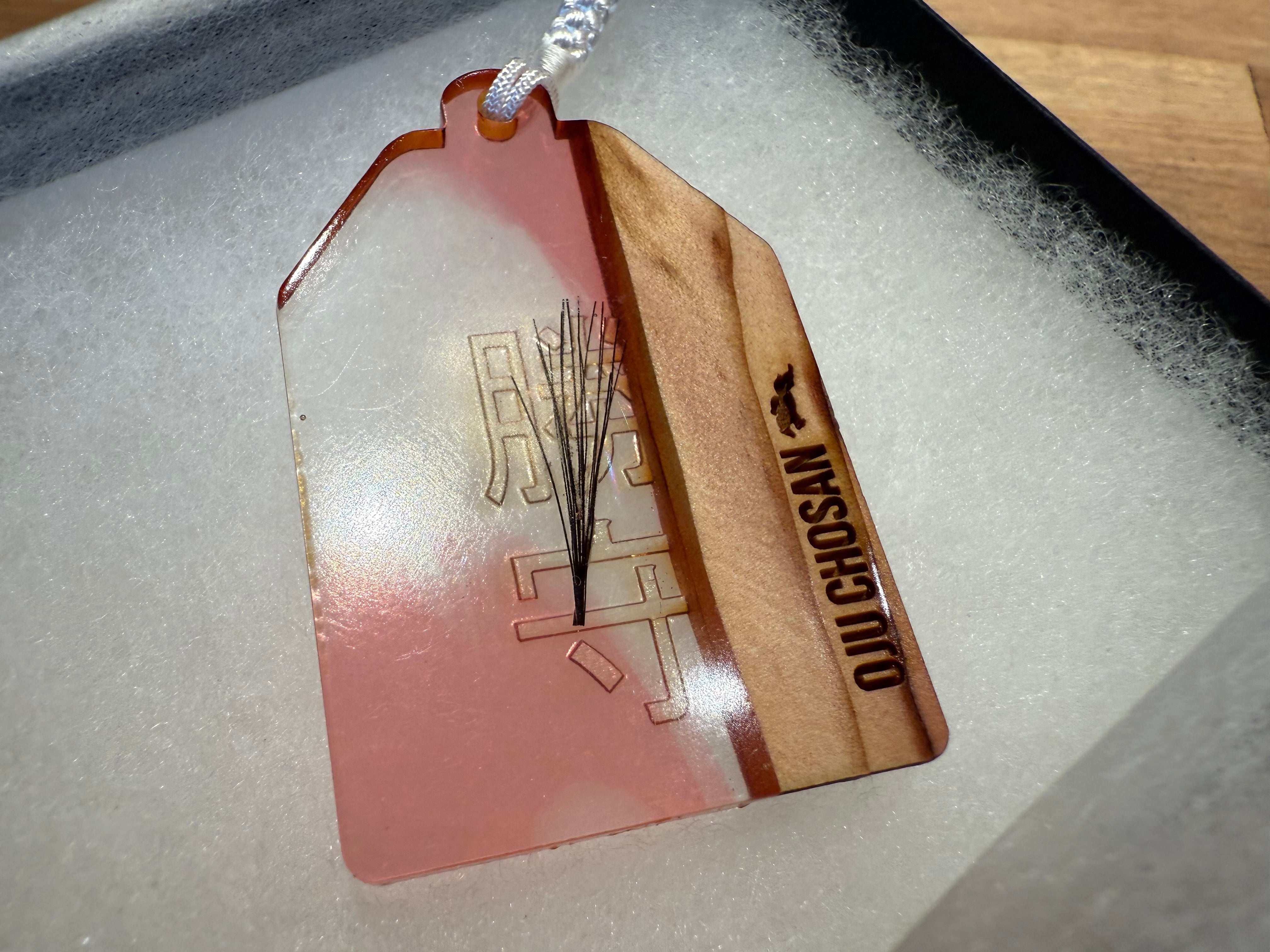 タニノギムレットが蹴って壊してしまった牧柵を再利用した完全手作りの御守りです。