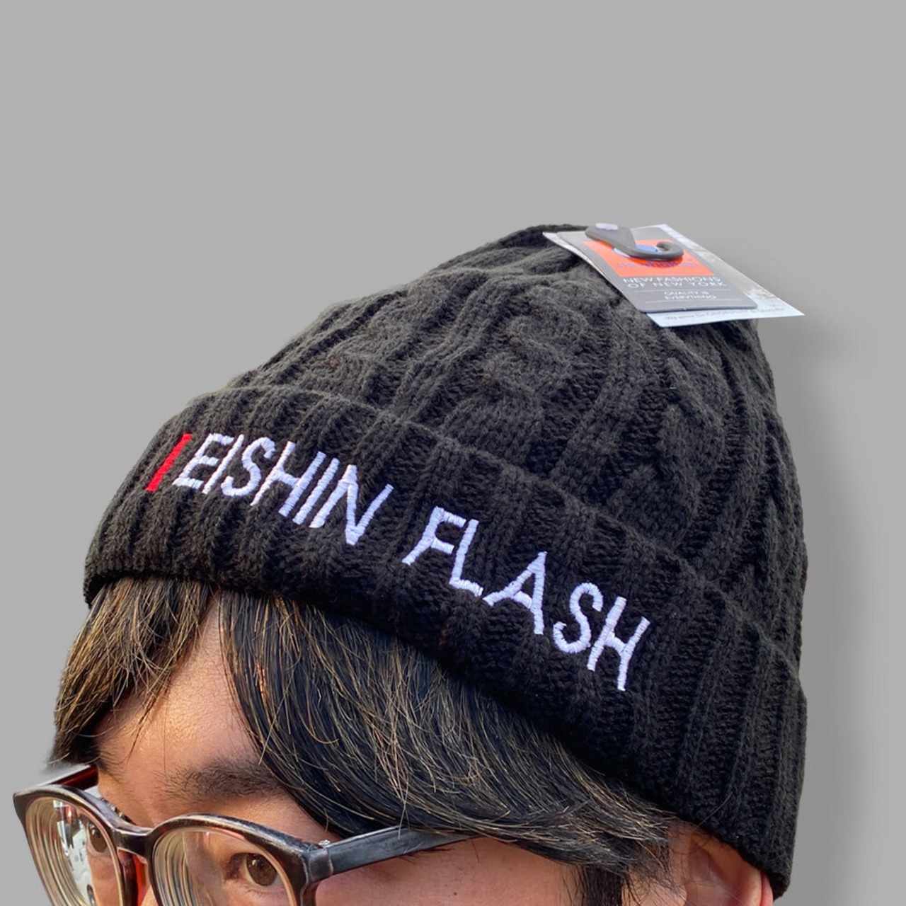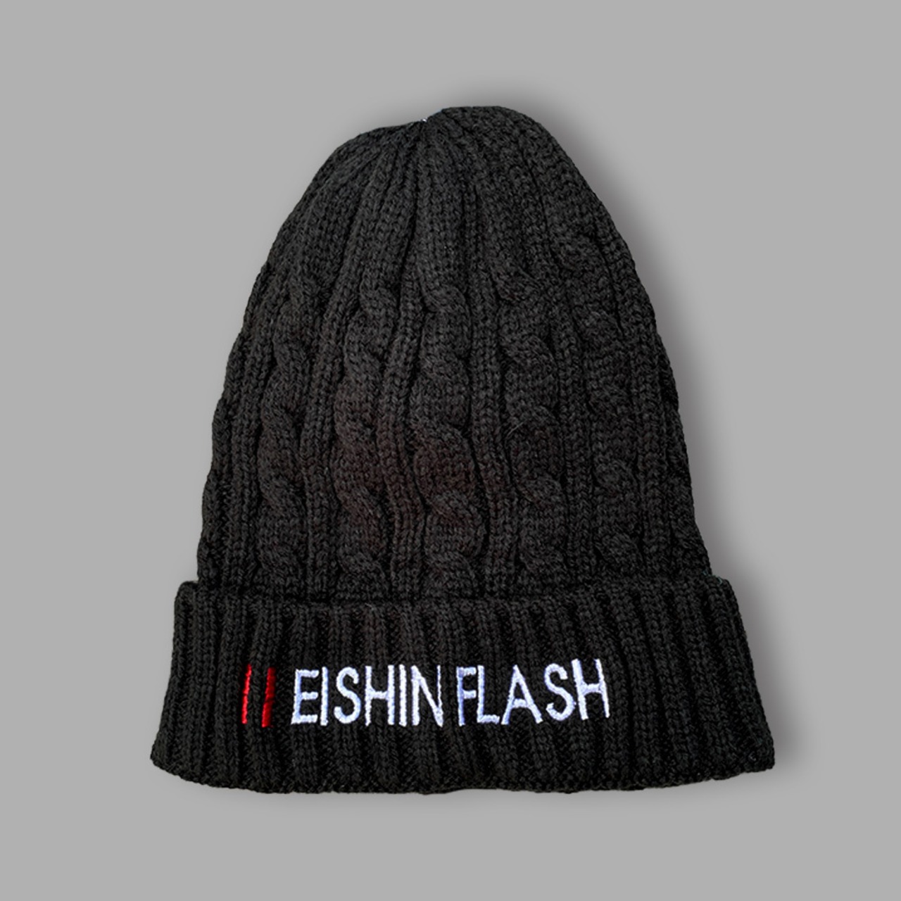 ケーブル編みのデザインニット帽子にエイシンフラッシュの名前が刺繍されたニット帽です。